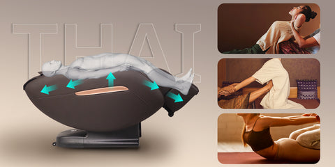 Thai stretching is one of the most famous techniques in Thai massage. A combination of zero gravity and Thai stretching -- while lying on a massage chair, the chair repositions the feet above the head, allowing blood to flow back from the feet to the heart and improve circulation. It then moves its feet down to create an obtuse Angle, stretching the body. Please be assured that all these are the most effective and suitable procedures designed by professional knowledge and technology.